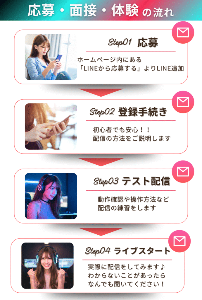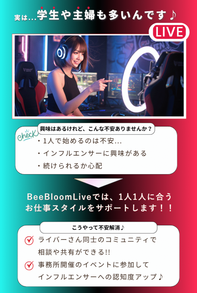 配信ノウハウの提供、ファンを増やすための戦略アドバイス、トラブル対応、さらに美容や撮影のサポートなど多方面からバックアップいたします。