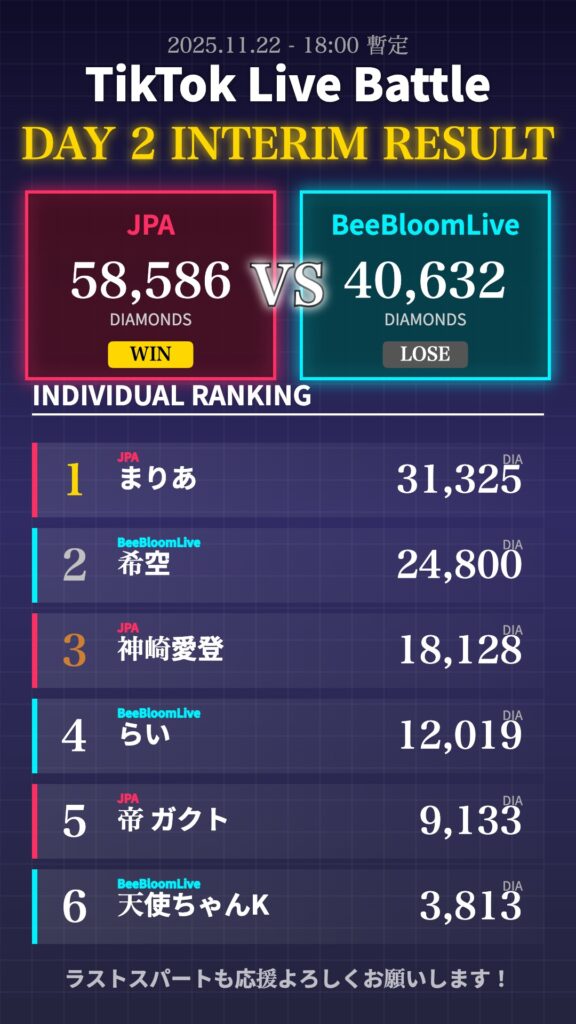 特に2日目夕方の追い上げでは会場・視聴者コメント欄が大いに盛り上がりました。