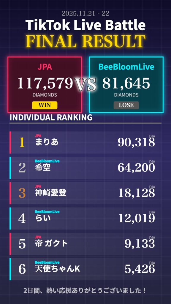 総獲得ダイヤ数でジャパンエージェントが僅差を制し勝利。